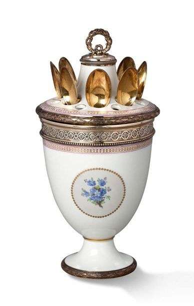 CONFITURIER en porcelaine KPM émaillée et dorée à décor de bouquets de violettes dans des médaillons perlés. Cerclage et prise à décor en argent. Suite de huit cuillères en vermeil à décor d'une coquille. Poinçon Minerve. Orfèvre Boin Tabouret. Cuillers numérotées. La théière est signée au revers, de la marque au sceptre, en bleu foncé sous couverte.
