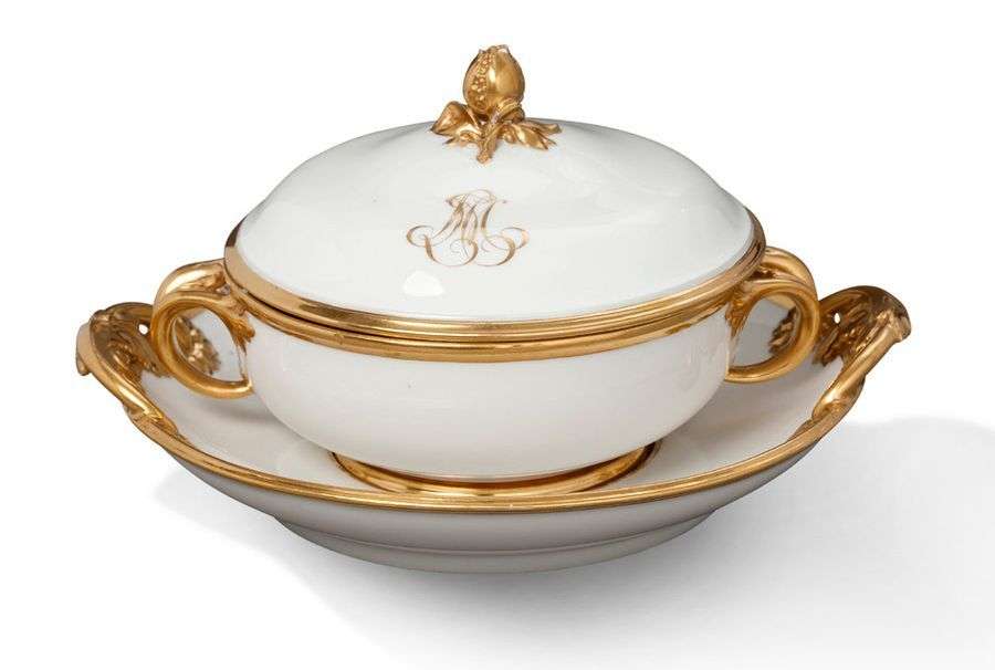 PETIT BOUILLON COUVERT en porcelaine chiffrée blanche et rehaut or. Prise formée d'une grenade éclatée, anses à enroulement.
