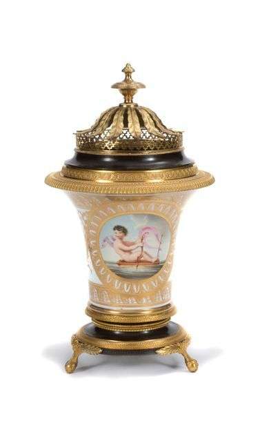 constitué d’un vase jasmin reposant sur trois pieds griffes et boules. Panse à décor de cupidon sur un radeau. Le couvercle orné de feuilles de laurier en bronze doré
