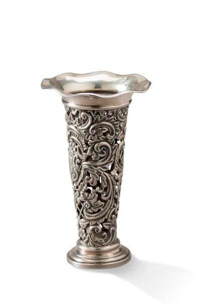 Grand et élégant verre de forme tulipe en argent repoussé, ciselé et ajouré d'un riche décor d'agrafes, de volutes, de fleurs et feuillages. Médaillon chiffré TA dans un écusson. Piètement à doucine et col évasé.
