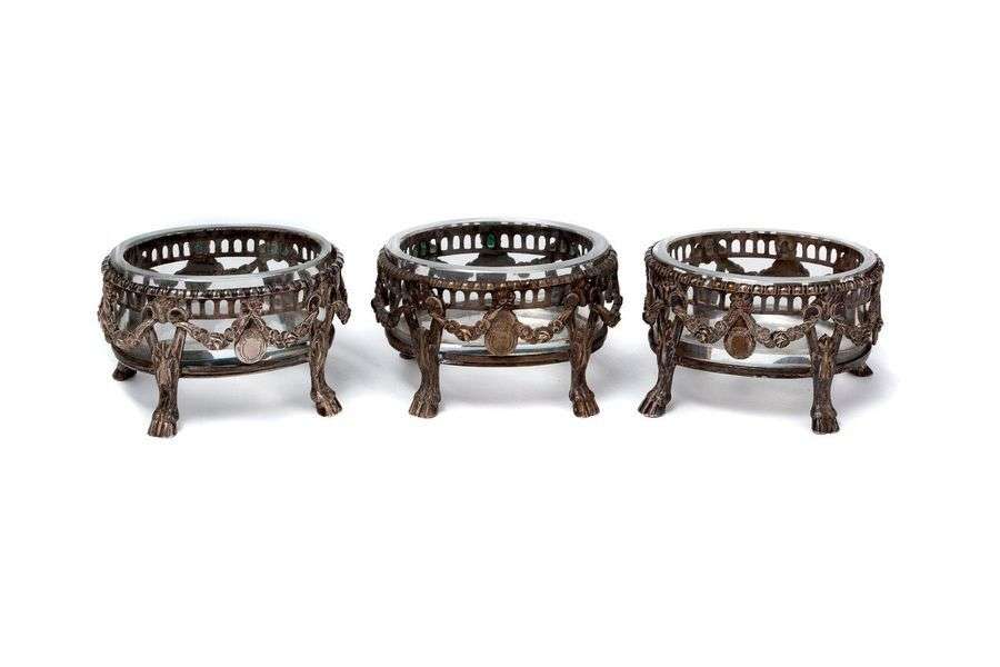 Suite de trois salerons. Les montures en métal argenté à décor de guirland