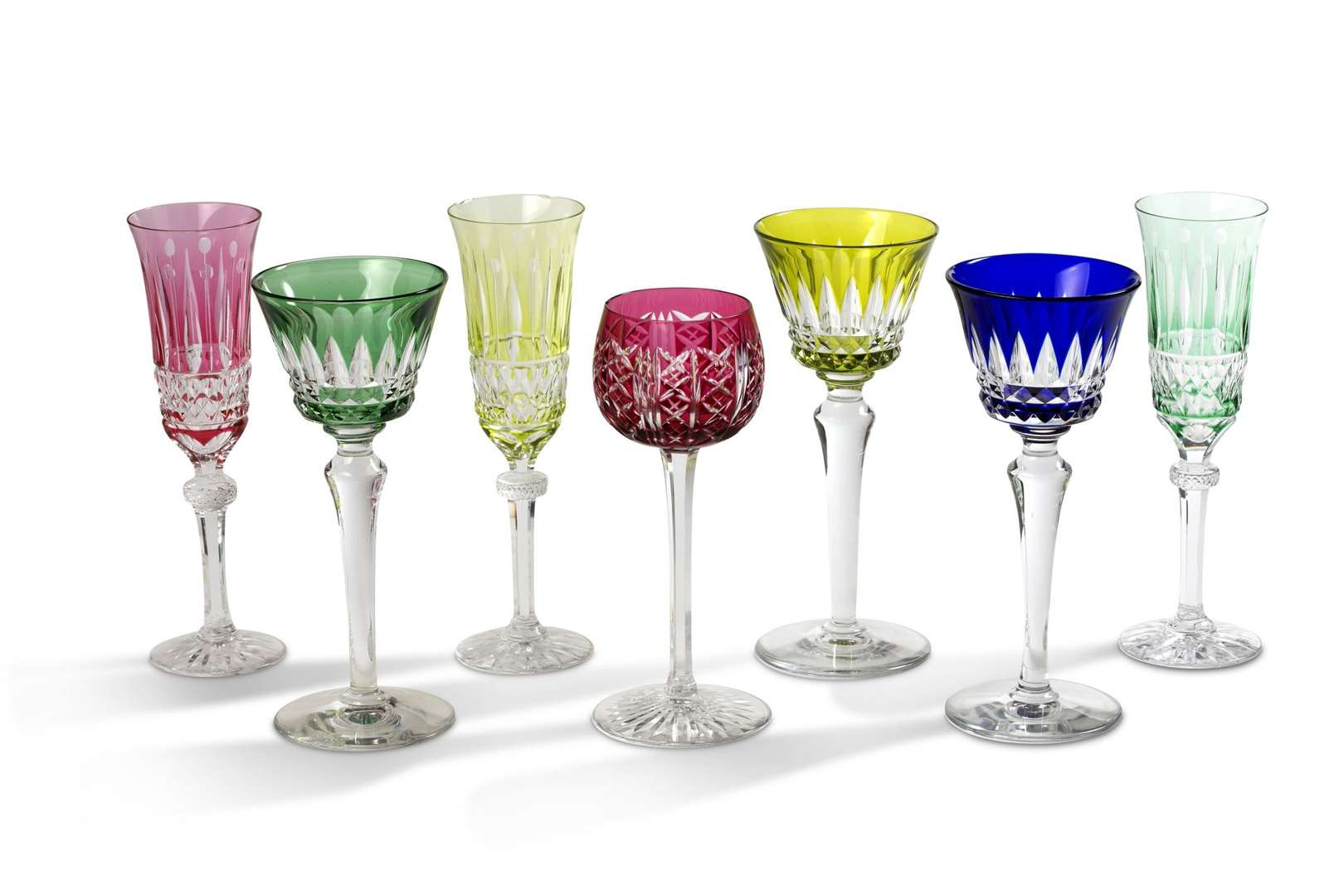 Ensemble de quinze roemers et dix flûtes à champagne en cristal taillé de couleur