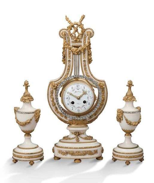 PENDULE LYRE ET PAIRE DE CASSOLETTES