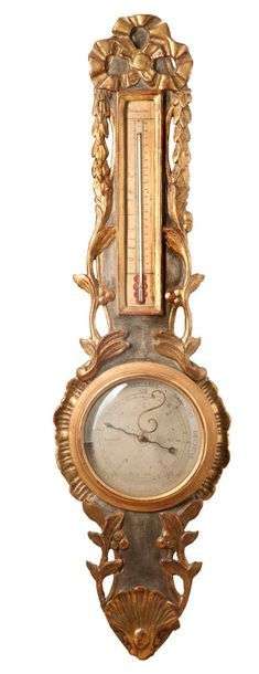 BAROMÈTRE en bois sculpté et doré orné d'un noeud rubanné d'où s'échappent des guirlandes de lauriers et feuillages. Par L. LG XVIIIe siècle H: 95 - L: 27 cm