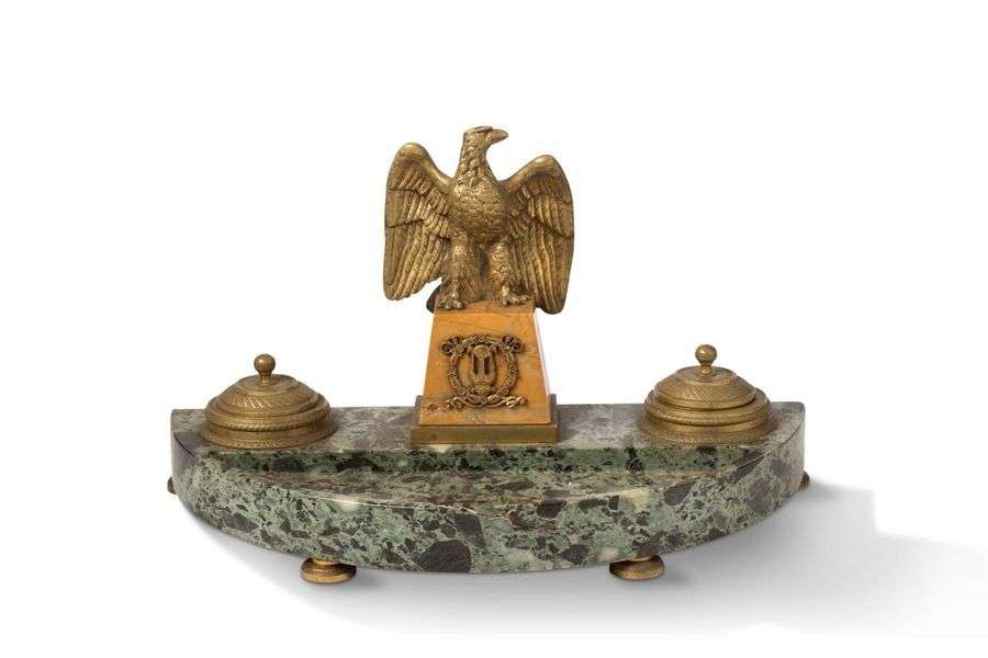 de forme demi-lune à décor d'un aigle aux ailes déployées reposant sur une gaine en marbre jaune de Sienne.