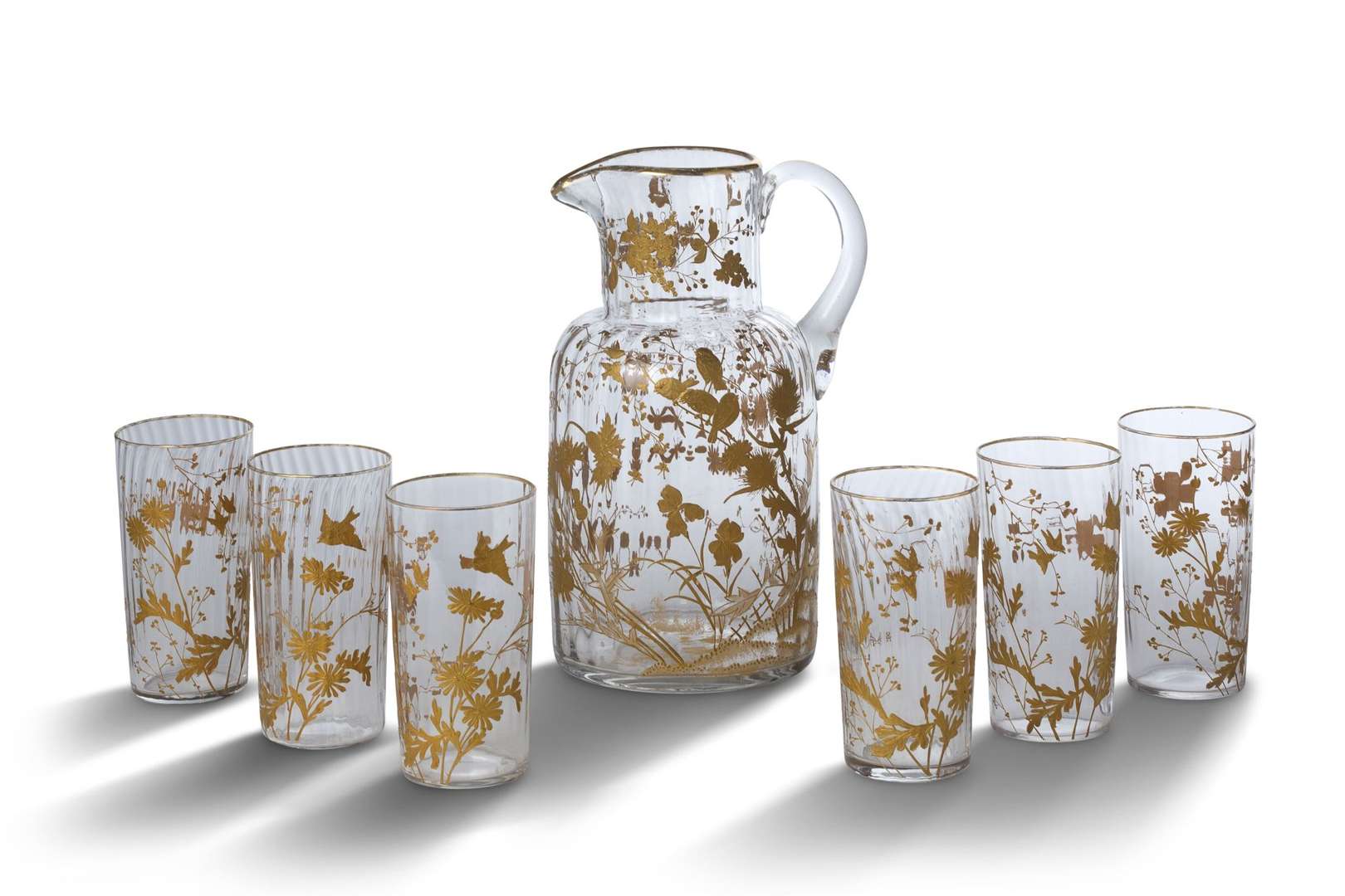 Très beau service à orangeade en verre soufflé rainuré à décor émaillé d'oiseaux branchés, et de fleurs. Il se compose de six verres et d'une carafe.