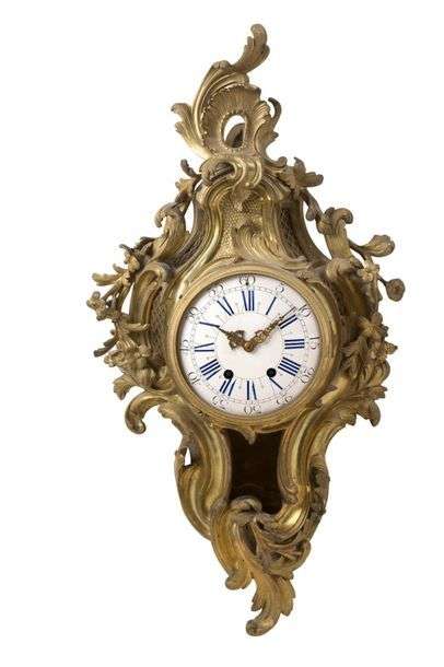 Cartel d'applique en bronze ciselé et doré à large décor mouvementé de rinceaux feuillagés, fleurettes, surmonté d’un cartouche rocaille. Cadran émaillé blanc présentant les heures en chiffres romains et les minutes en chiffres arabes.