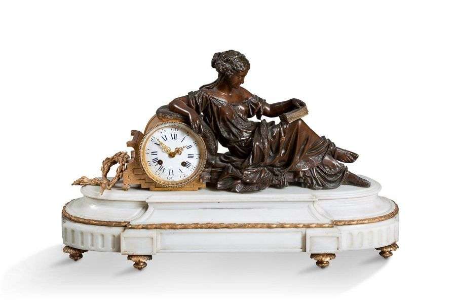 Pendule en bronze patiné et doré figurant une femme allongée lisant.