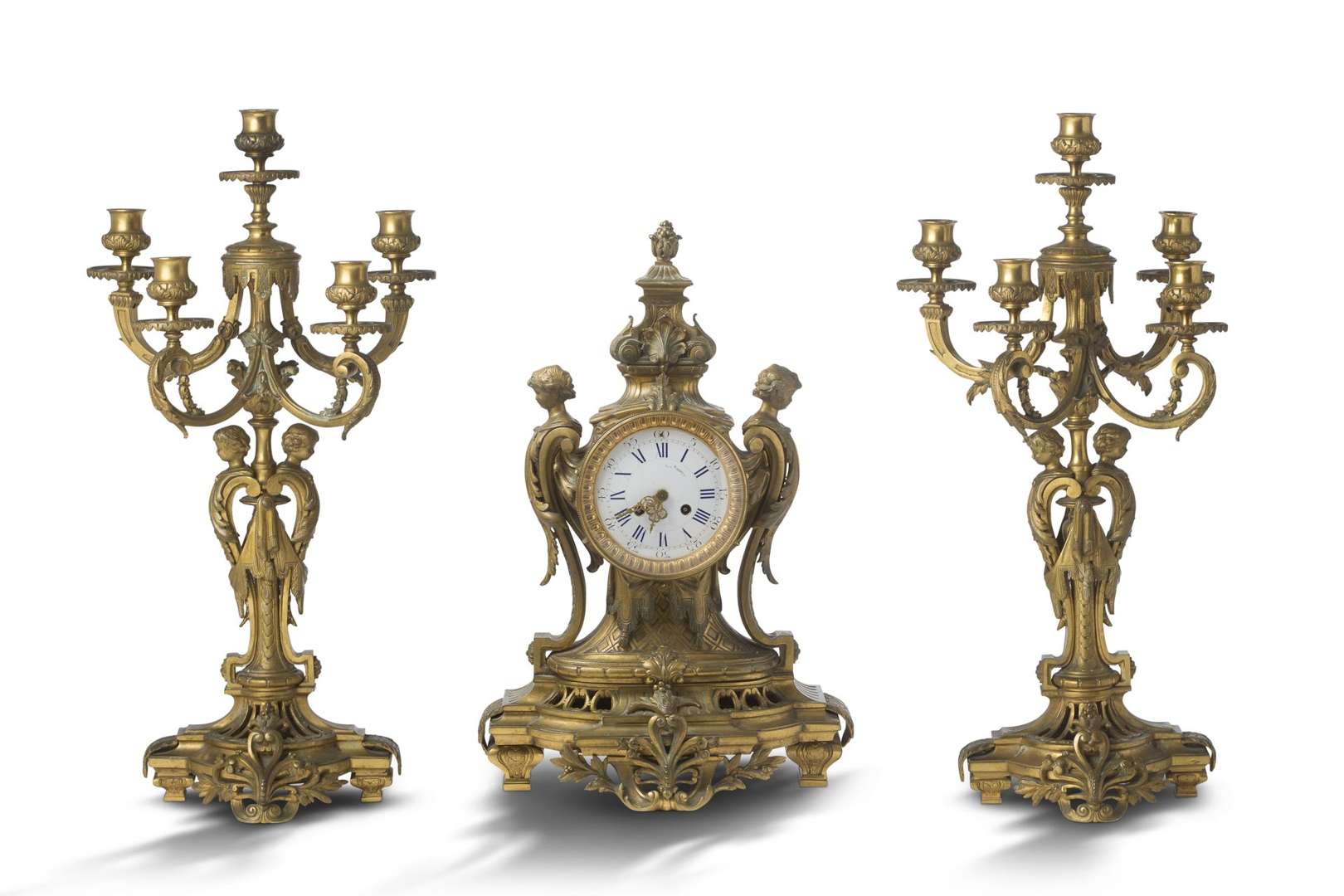 en bronze ciselé comprenant une paire de candélabres à quatre bras de lumière, un fût central et un pendule. Cadran émaillé blanc présentant les heures en chiffres romains et les minutes en chiffres arabes.