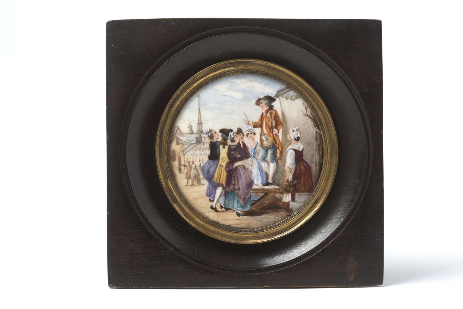 Miniature sur ivoire, de forme ronde, dans un encadrement en bois noirci