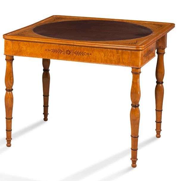 PAIRE DE TABLES À JEUX en placage d'érable mouluré et palissandre à décor de rinceaux. Le plateau ouvre et découvre une surface gainée de cuir doré aux petits fers (rapporté). Elles reposent sur quatre pieds balustre tournés.