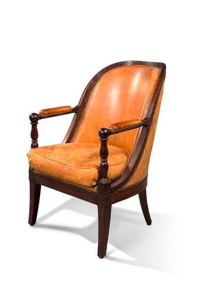 Fauteuil en acajou et placage d'acajou à dossier gondole. Les accotoirs à manchettes droit sont terminés par des boules, ils reposent sur des consoles d'accotoirs en forme de balustre à profil inversé. Pieds sabres. Garniture en cuir.