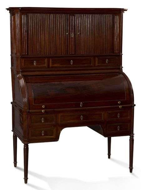 BUREAU CYLINDRE en acajou reposant sur quatres pieds fuselés cannelés s'ouvrant par cinq tiroirs en ceinture, découvrant une tablette d'écriture, deux tiroirs et un caisson central.