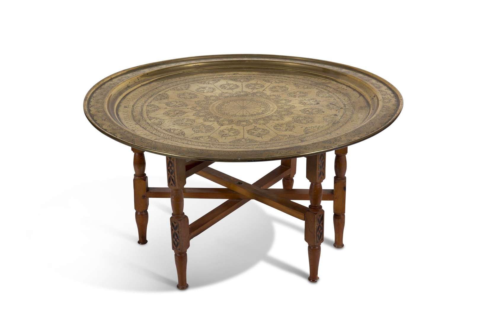 Table à thé, le plateau en laiton gravé de rosaces. Piètement pliant en bois à six pieds ~