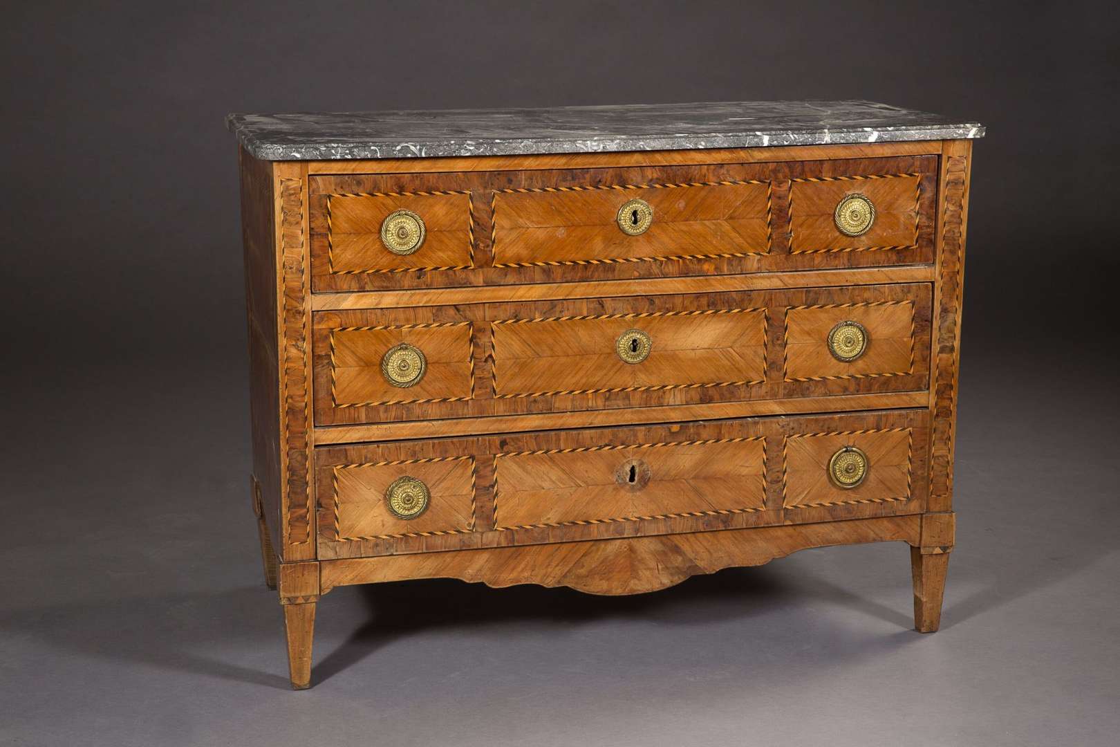 ouvrant en façade par trois tiroirs, placage en frisage en aile de papillons dans des encadrements en marqueterie de filets de bois alternés.