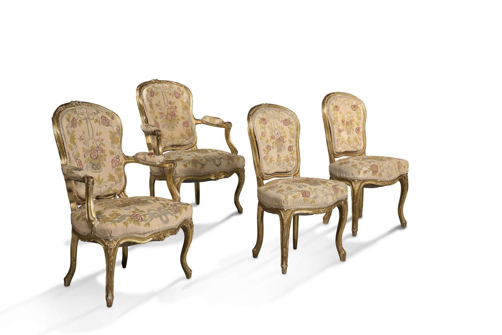 comprenant un canapé, deux paires de fauteuils cabriolets et quatre chaises à dossier en anse de raquette en hêtre sculpté, mouluré et redoré à décor de fleurettes, pieds cambrés.
