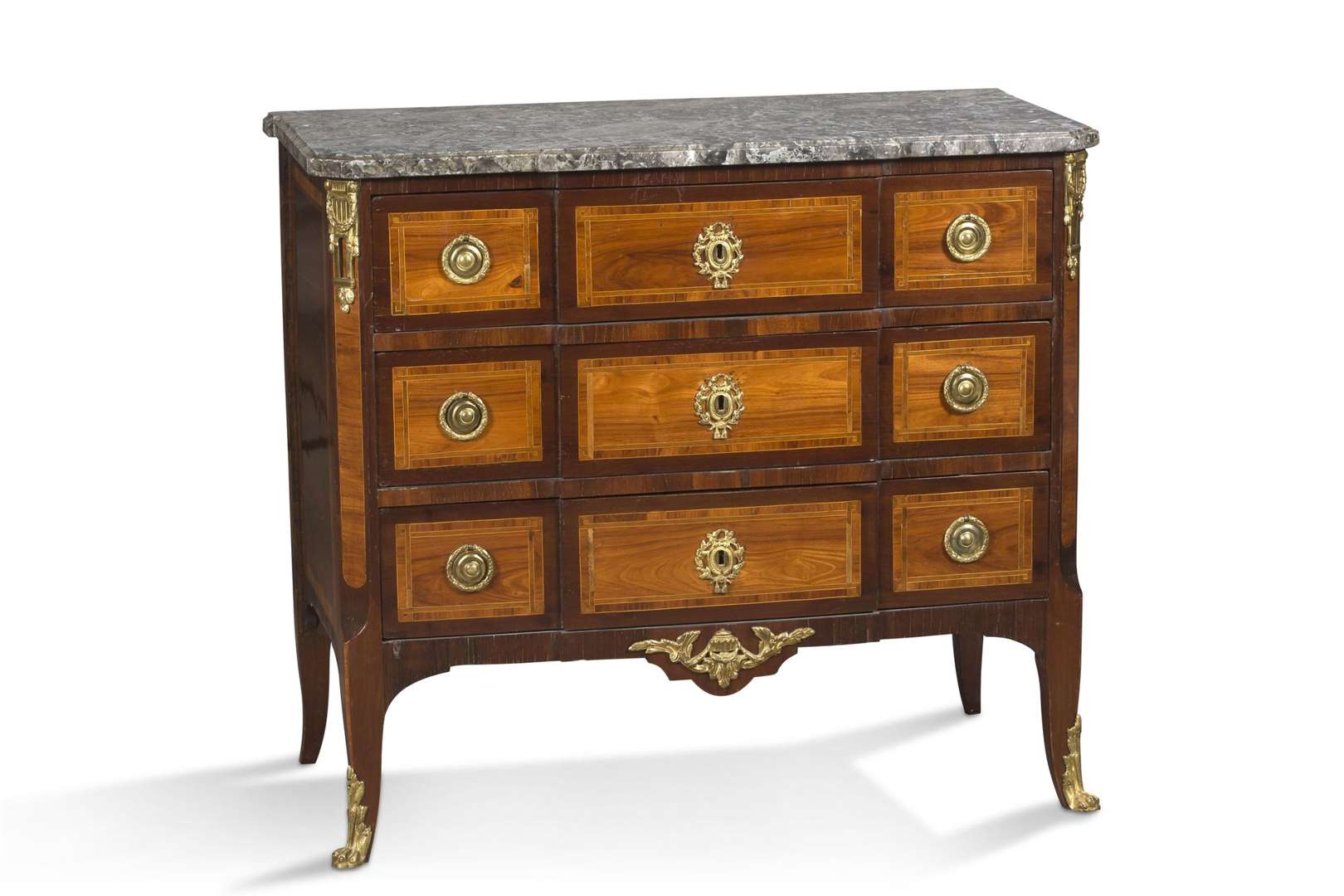 à léger ressaut central, ouvrant en façade par trois tiroirs en placage de satiné à décor géométrique, et encadrement de palissandre. Montants à pans coupés, Elle repose sur des pieds galbés. ~