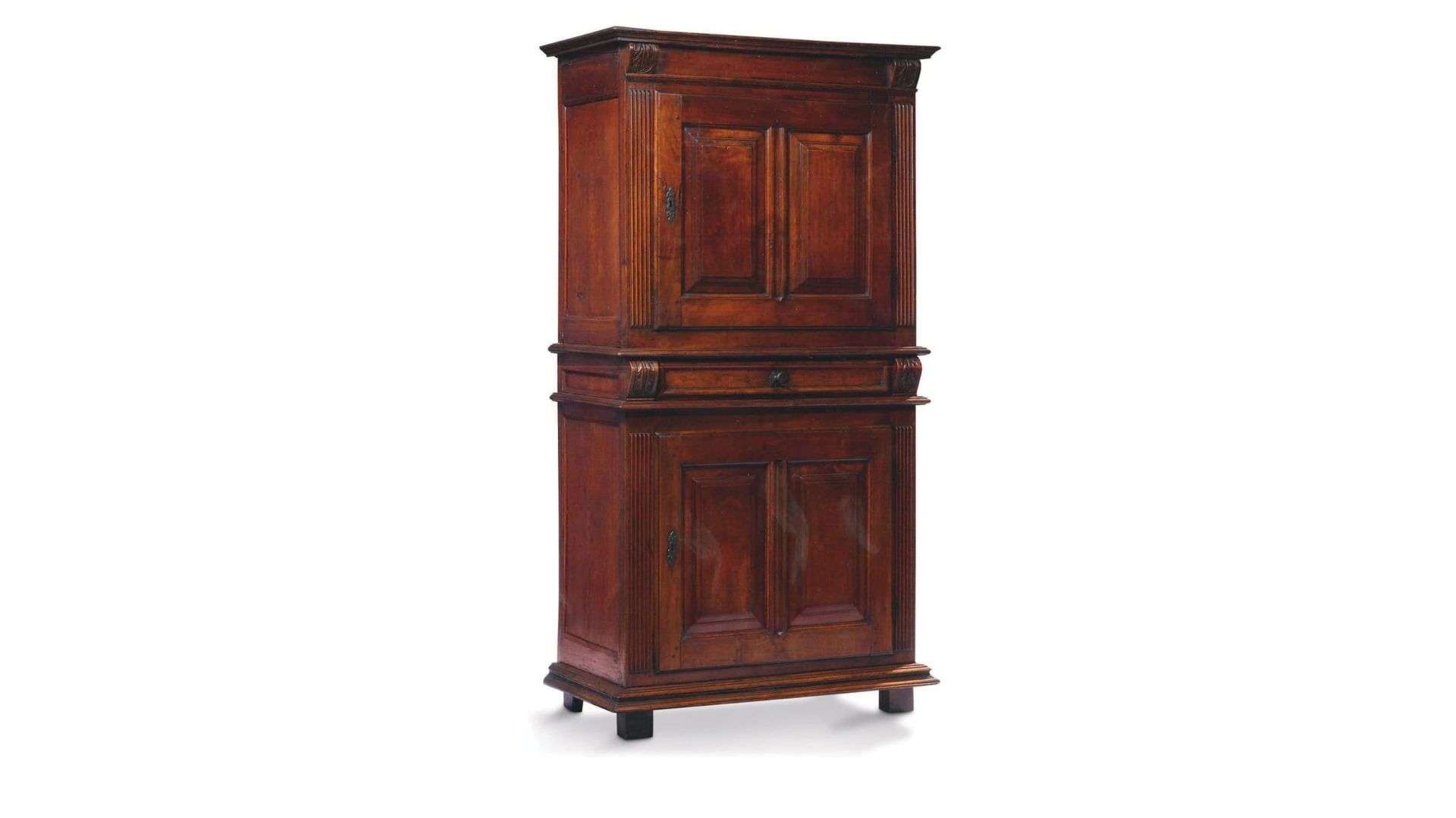 L'armoire s'est dégagée du mur dans laquelle elle s'encastrait pour devenir un véritable meuble d'applique . Mais l'esprit de ces premières armoires perdure. Témoin ce beau modèle dauphinois, dont le fond et les côtés sont fabriqués en bois de conifère, la façade en noyer rassemblant tous les éléments d'un décor proposé en vue frontale.~