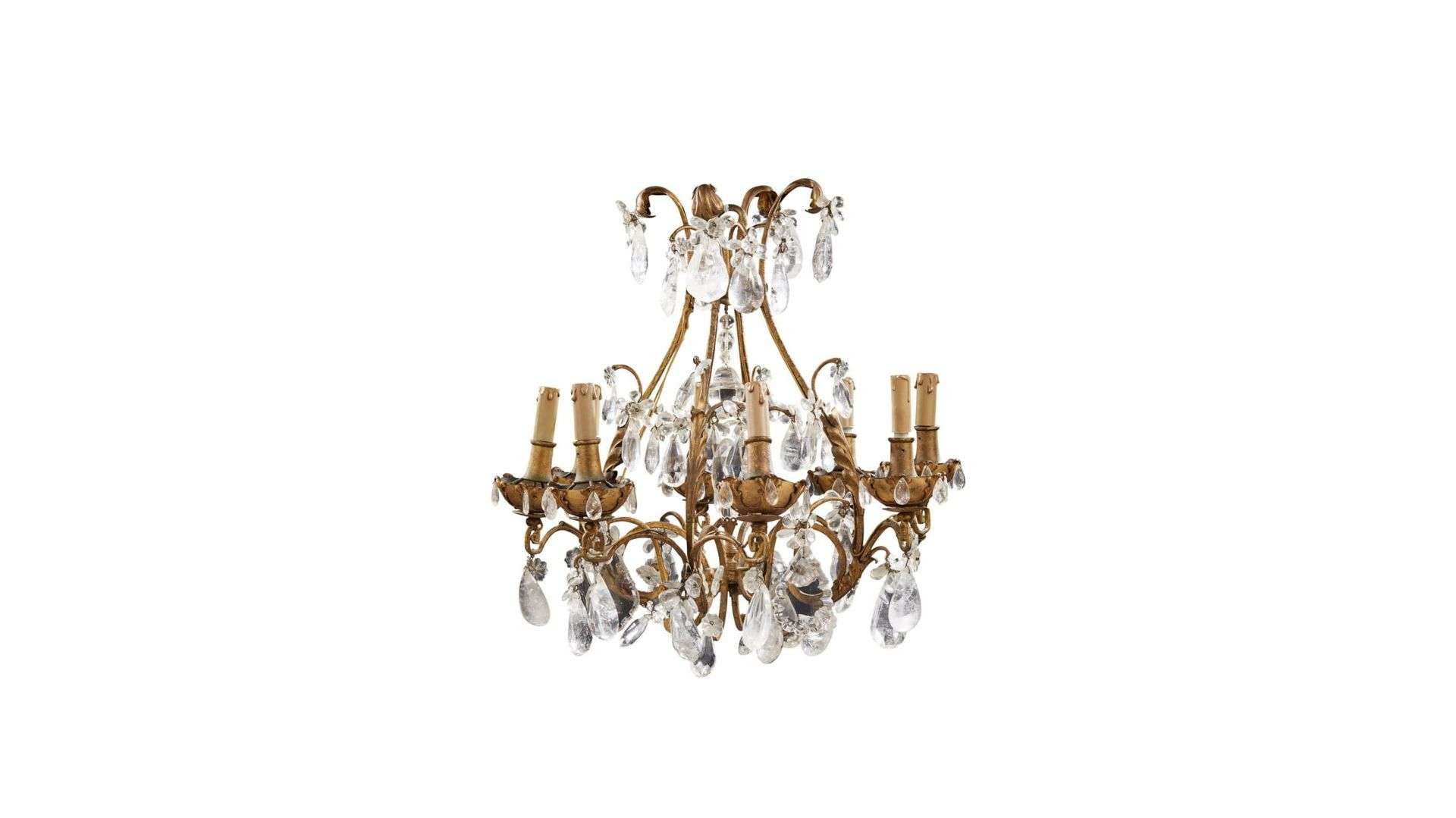 Lustre en bronze doré et pendeloques en cristal de roche composé de huit lumières.~