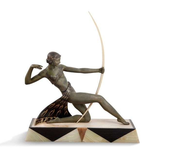 SCULPTURE en régule vert représentant Diane châsseresse sur un socle en albâtre et marbre. Vers 1930