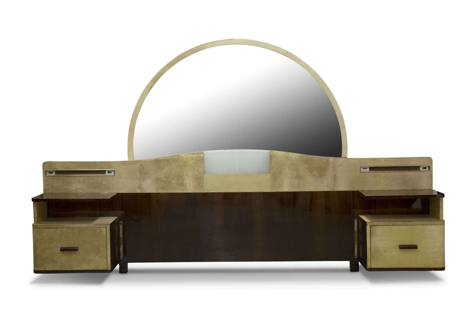 en bois de placage et parchemin, comprenant une tête de lit intégrant les chevets et un important miroir circulaire~