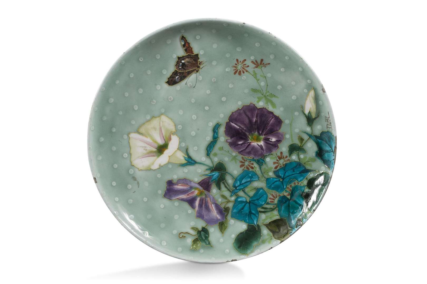 Assiette circulaire en céramique émaillée polychrome à décor de motifs floraux et de papillons en vol sur fond céladon à pois.~