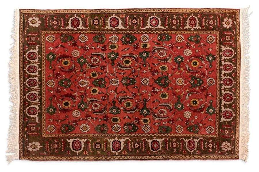 Velours en laine sur fondations en coton. Champ brique à decor Hérati à semis de larges palmettes de fleurs et feuillages stylisés géométriquement en forme de diamants en polychromie