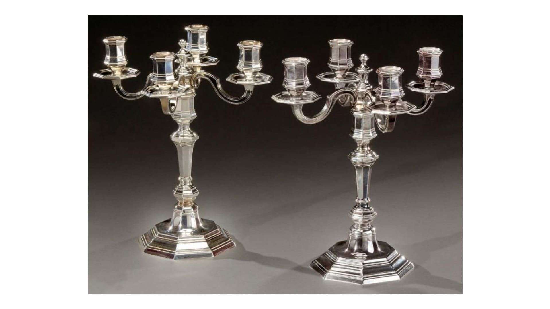 Paire de candélabres à quatre bras de lumières en métal argenté. Fûts balustre.
