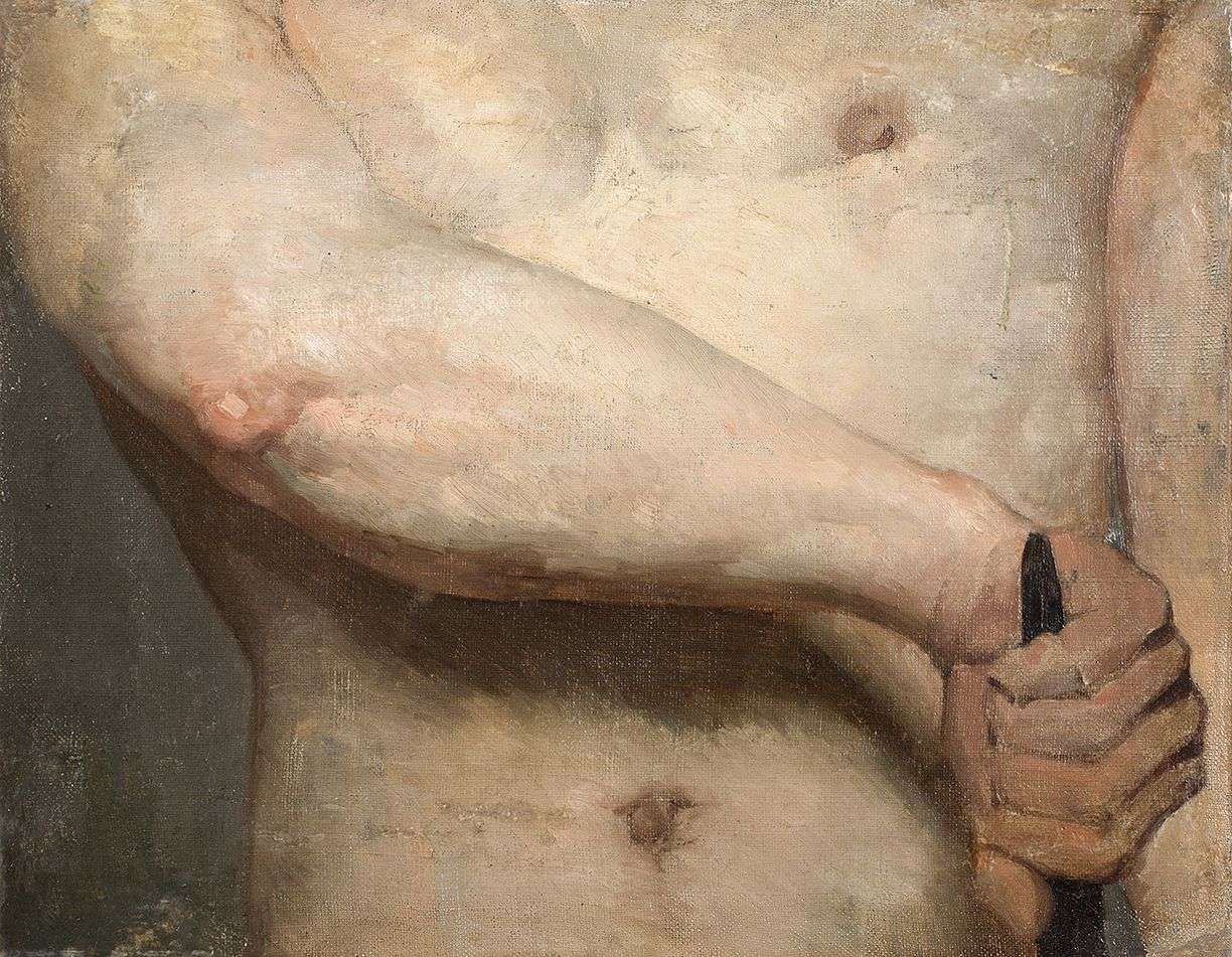 Académie de ventre nu avec main s'appuyant sur un bâton noir
