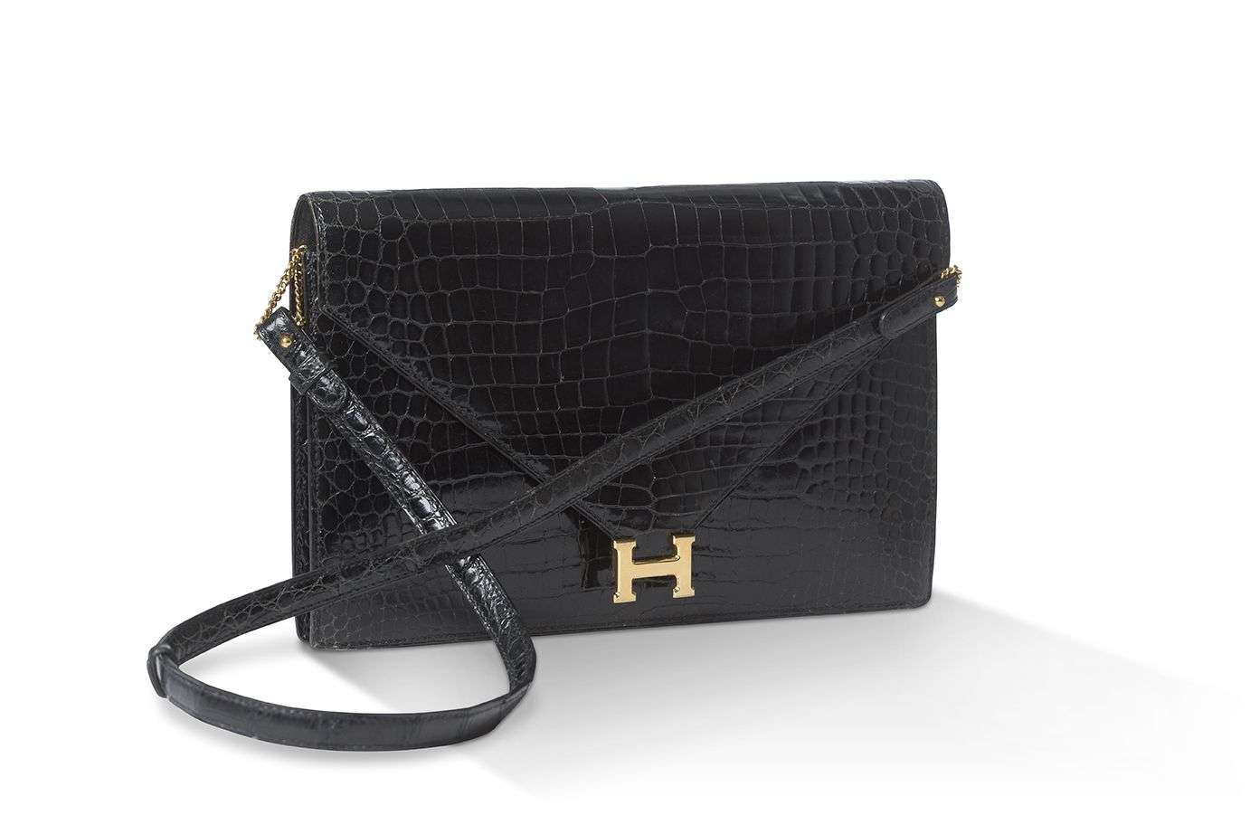 Pochette vintage rectangulaire porté épaule, croco noir (crocodilus Porosus)