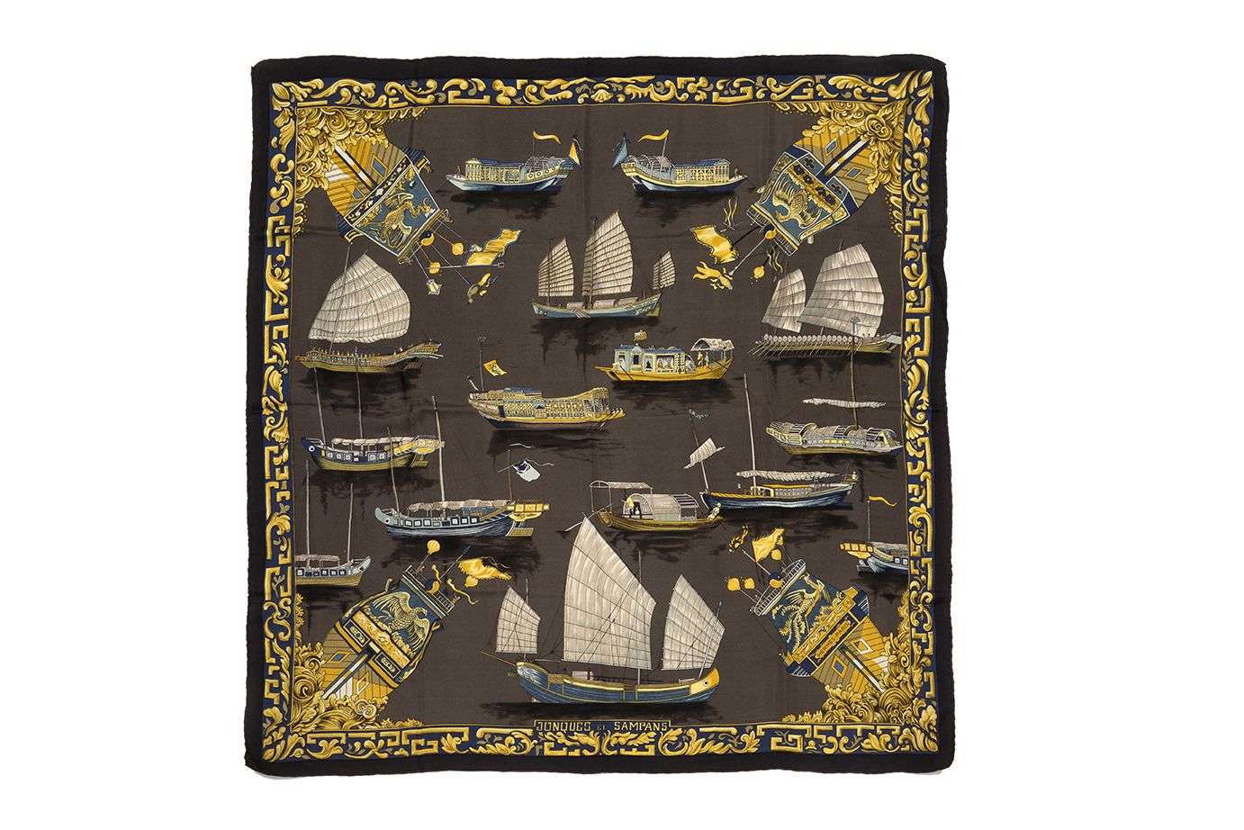 Carré en soie, gris, jaune d'or, bleu et bordures noires à décor de navires et frégates.