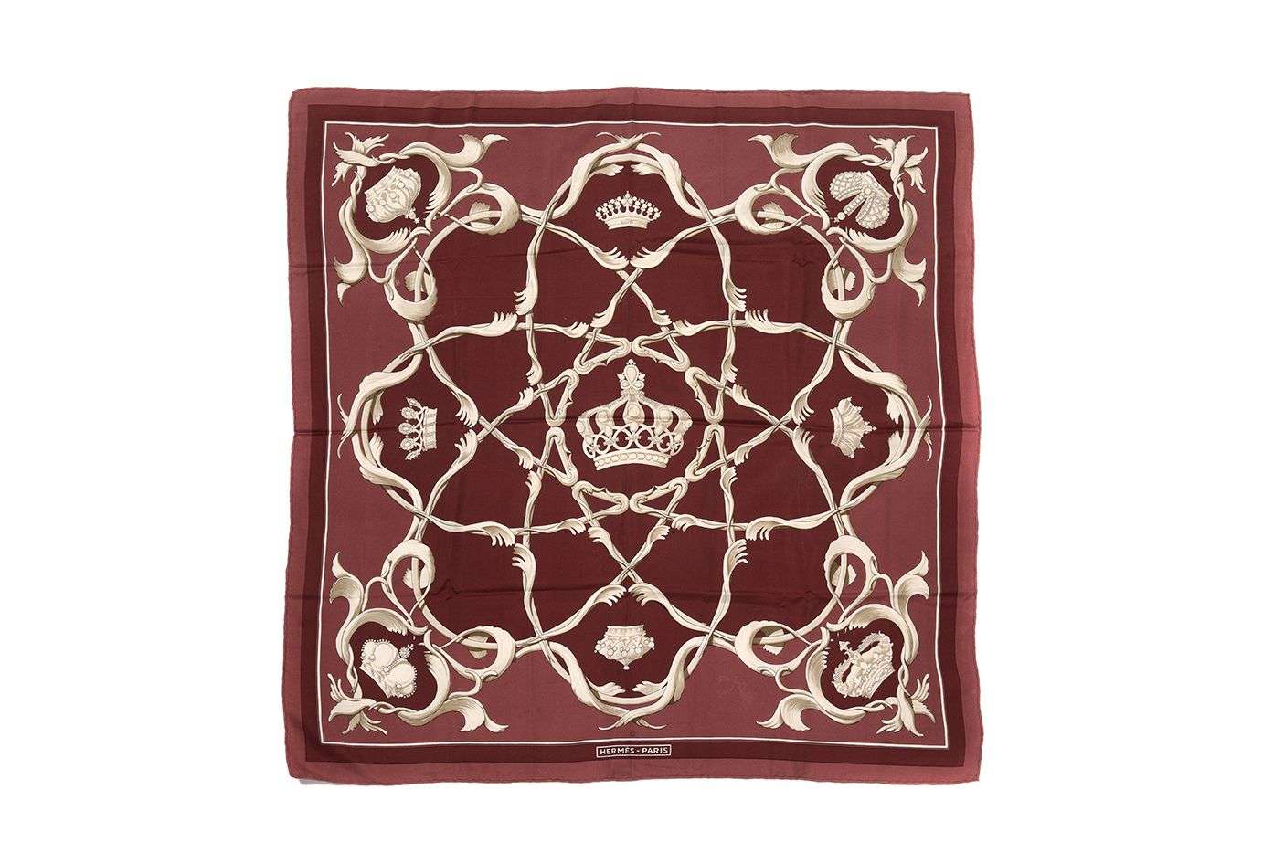 Carré en twill de soie, tons de bordeau, blanc cassé