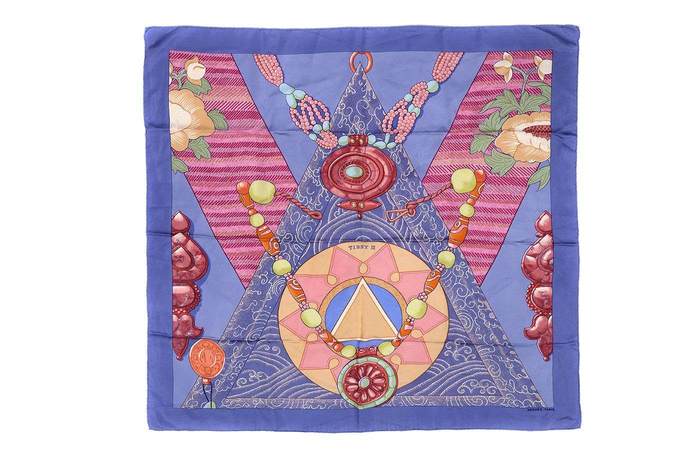 Carré en soie violet, mauve, rose et jaune dans les tons pastel avec décor produits issus de l'artisanat de la région nord de l'Himalaya.