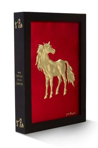 In - 4 en feuilles, couverture illustrée en couleur. Emboîtage en percaline noire avec fenêtre sur le plat, orné d'un cheval doré estampé sur fond rouge.Exemplaire sur Japon nacré n°40/100. Signé par l'éditeur et l'artiste avec constat d'huissier.