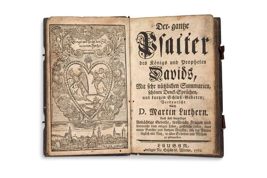 Der gantze Psalter des Königs und Propheten Davids : Mit sehr nuklichen Summarien, schonen Denct Spruchen, und furken Schlub Gebeten / verdeutscht durch D. Martin Luther [...]. Laubar, Nic. Schills sel. Wittme, 1760