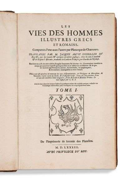 Les Vies des hommes illustres grecs et romains, comparées l'une avec l'autre par Plutarque de Chæronee. Translatées de grec en françois par M. Jacques Amyot Conseiller du Roy &c, par lui revenuës & corrigees en infinis passages. Avec les vies d'Annibal et de Scipion l'Africain, traduites de Latin en François par Charles de l'Escluse [...]. [Genève], de l'Imprimerie de Jérémie des Planches, 1583