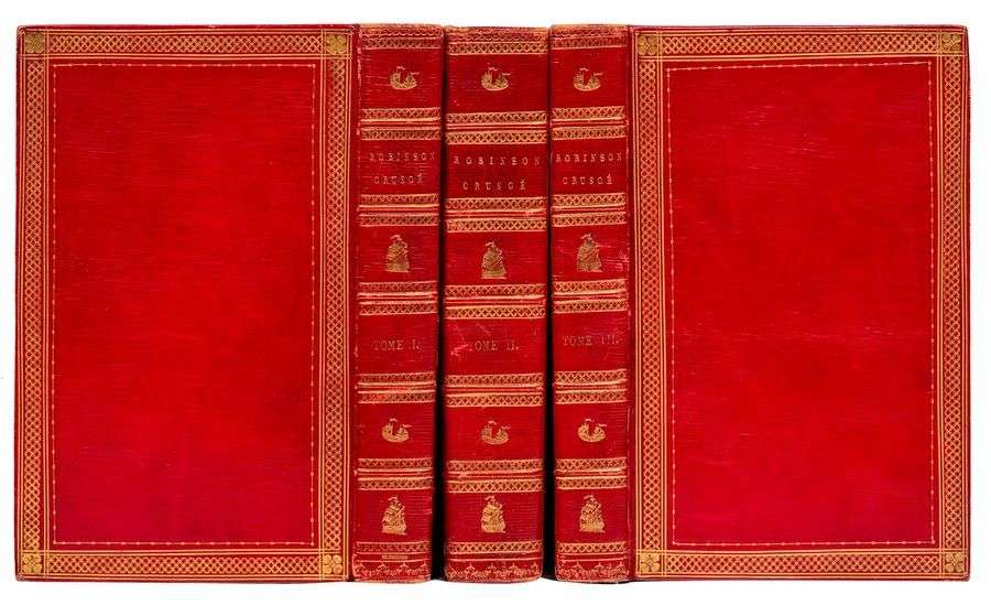 La Vie et les Aventures de Robin Crusoé. Paris, Veuve Panckoucke, An VIII de la République [1800]. 3 volumes grand in-8, maroquin rouge à long grain, encadrement de chaînettes entrecroisées bordé de filets torsadés, quatrefeuilles dans les coins, dos à petits nerfs orné de roulettes et fers spéciaux alternés aux voiliers, filet doré sur les coupes, roulette intérieure dorée à la grecque, tranches dorées (Reliure P. Bozerian).