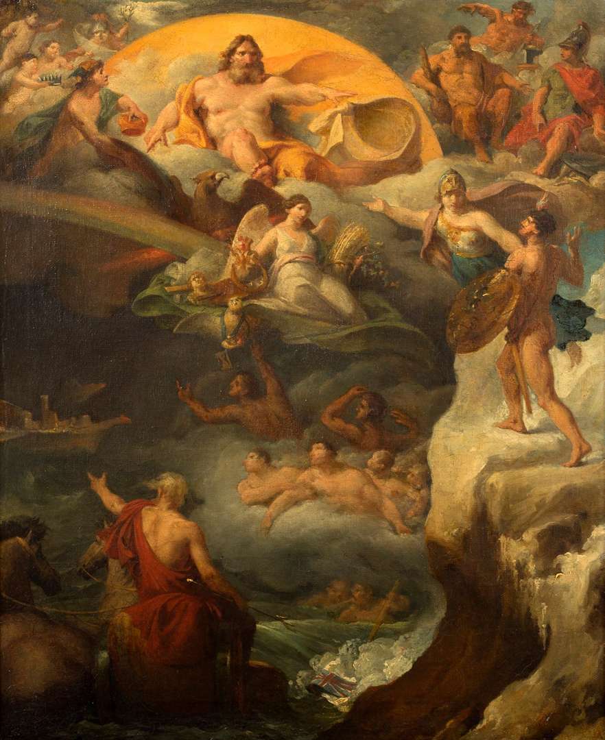 Ici, la bataille de Grand Port est identifiable par la présence du drapeau anglais s'échouant en bas de composition contre les récifs et le navire démâté à gauche dans l'arrière-plan.