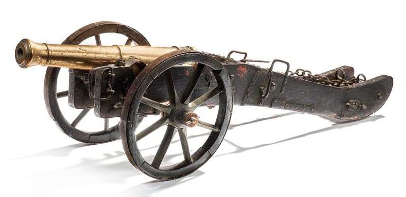Fût en bronze tulipé avec affût en bois et fer, roues postérieures. Travail du premier tiers du XIXe siècle.