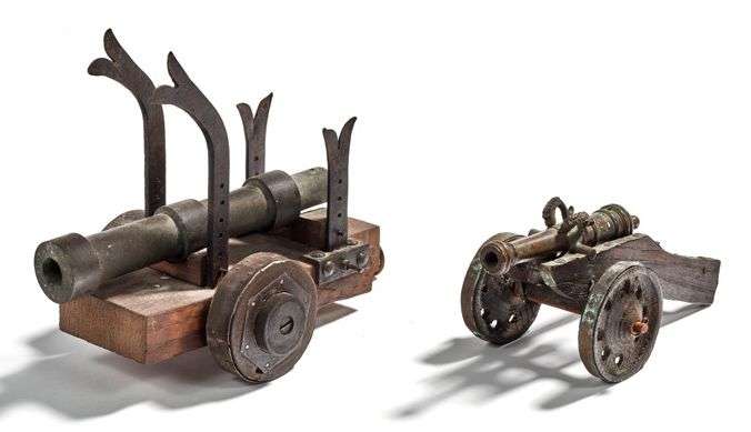 Un type guerre de Cent ans monté sur un affût en bois et fer, longueur 25 cm. Le second, beau fût type Louis XV en bronze monté sur affût en bois. Longueur 20cm. Travail du XIXe siècle