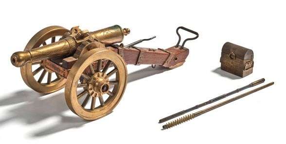 D'après un modèle d'époque Louis XIV. Fût en laiton ciselé «XVII S» dans un soleil rayonnant, portant la date 1661. Affût en bois et roues à rayons en laiton.