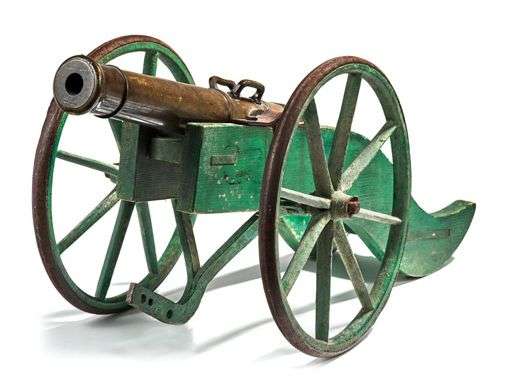 FORT CANON en bronze. Remonté sur un affût en fer et bois peint en vert. L'affût est prévu pour recevoir un mécanisme de mise à feu à percussion probablement pour le service dans la Marine de la seconde moitié du XIXe siècle. 53 cm pour le fût Longueur totale: 84 cm
