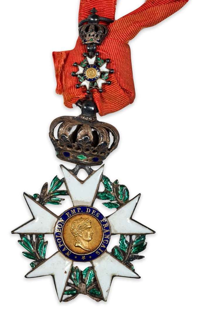 Légion d'honneur instituée en 1802 époque Premier Empire du troisième type. Argent, à cinq branches à double pointes non pommetées, émail et centre en or avec son ruban d'origine, sur lequel est présente également la réduction à cinque branches à double pointe pommetées en argent, émail et or. Ces médailles proviennent du soldat Vanier.