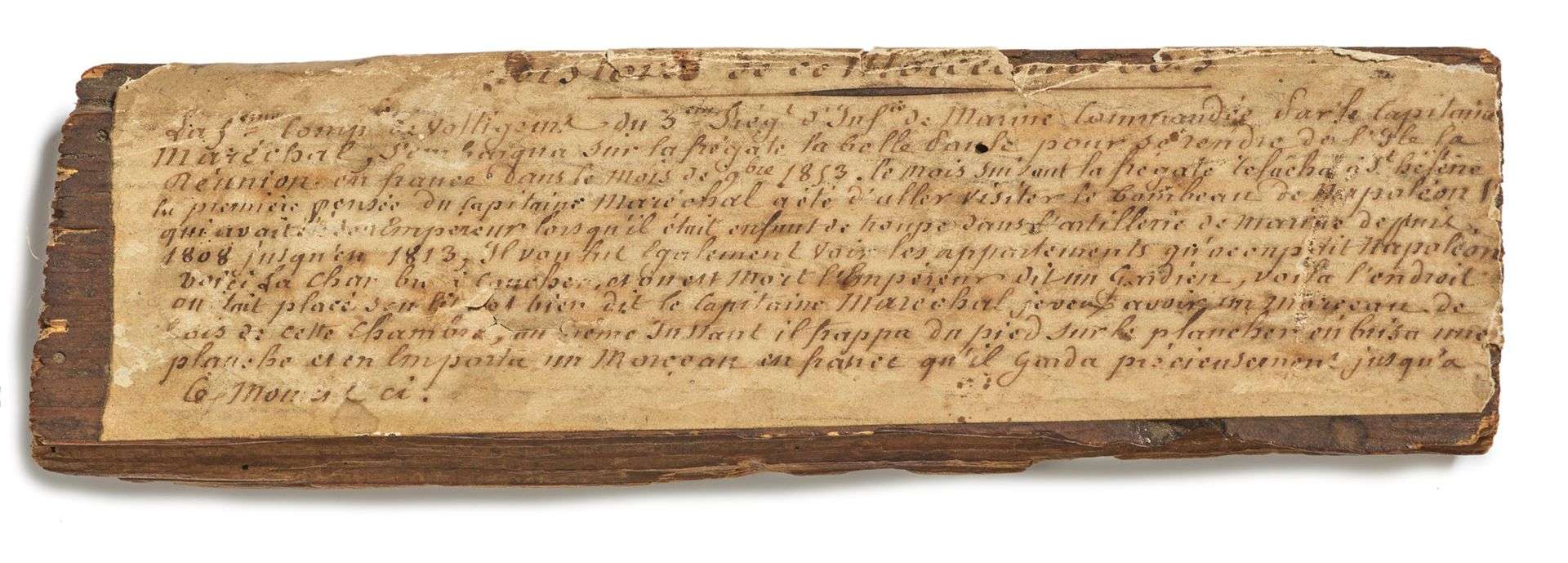 Portant une étiquette sur laquelle est inscrit : «5e comp de voltigeurs du 3e Reg d'inf de Marine commandé par le capitaine Marechal, s'embarqua sur la frégate la belle poule pour se rendre sur l'ile de la Réunion en France dans le mois de 9bre 1853 le mois suivant la frégate le lâcha à St Hélène. La première pensée du capitaine Maréchal a été de visiter le tombeau de Napoléon Ier qui avait été son Empereur lorsqu'il était enfant de troupe dans l'artillerie de marine. Depuis 1808 et jusqu'en 1813, il voulut également voir les appartements qu'occupait Napoléon. «Voici la chambre où est mort l'Empereur» dit un gardien, «voilà l'endroit où était placé son lit». «Bien» dit le Capitaine Maréchal, «Je veux avoir un morceau de bois de cette chambre». Au même instant, il frappa du pied sur le plancher, en brisa une planche et en emporta un morceau en France qu'il garda précieusement jusqu'à ce moment-ci»