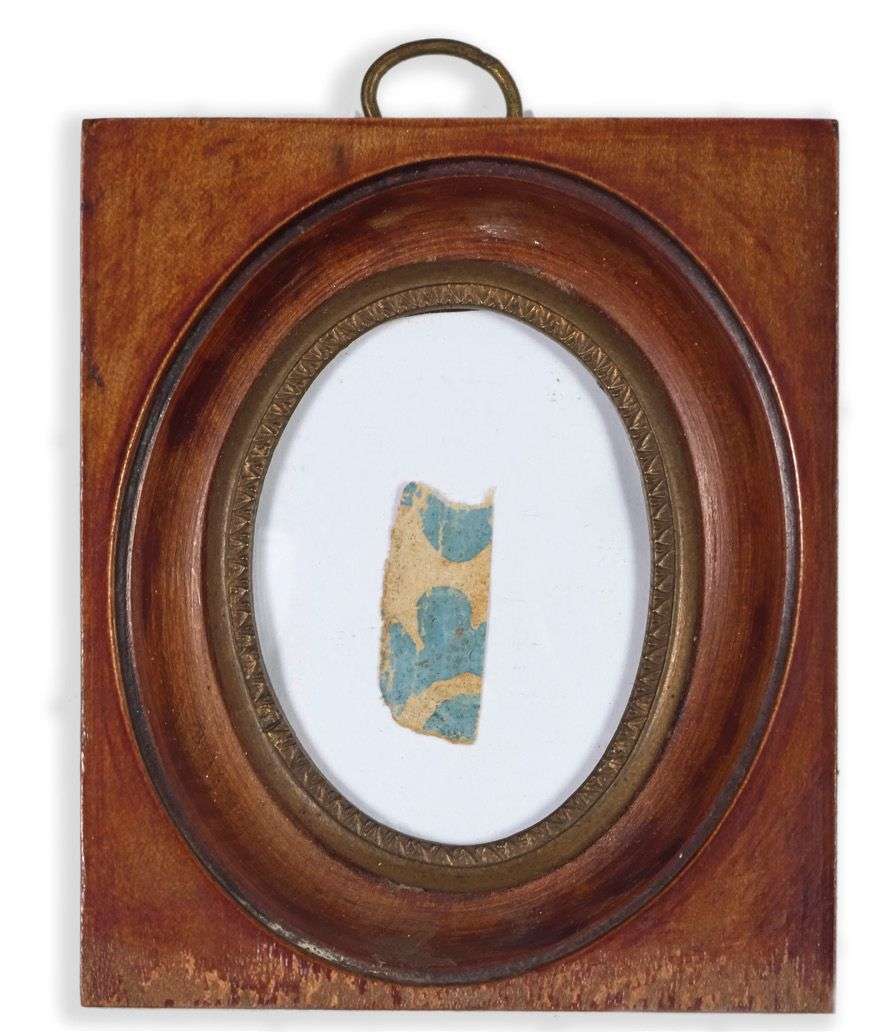 PAPIER PEINT DE LA CHAMBRE DE L'EMPEREUR Fragment de papier peint imprimé de motifs géométriques bleus sur fond blanc. Il est présenté sous verre dans un cadre en bois rectangulaire. Il est accompagné de son enveloppe d'origine sur laquelle est inscrit «Morceau de tapisserie de la chambre de Napoléon à Sainte Hélène». Cet imprimé est en effet à rapprocher du papier peint présent à Longwood qui lui aussi est également à motifs géométriques bleus sur fond blanc.