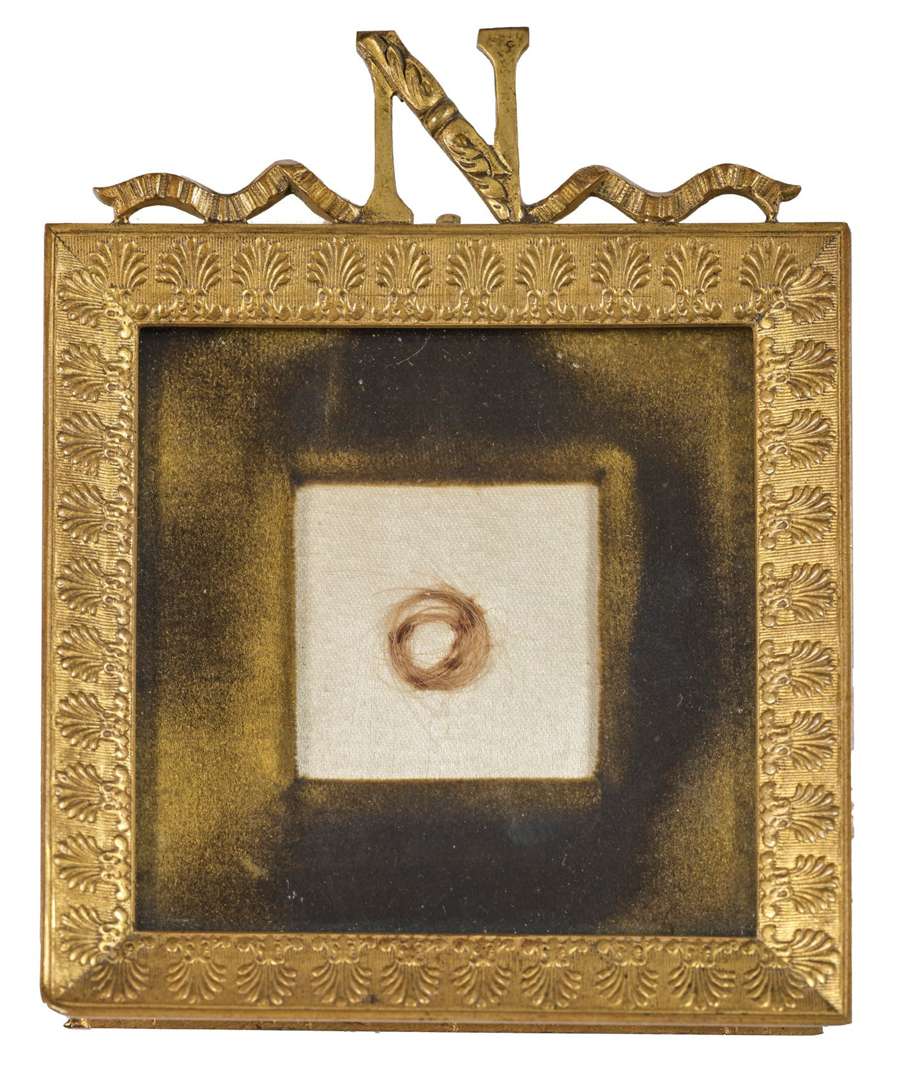 MÈCHE DE CHEVEUX DE L'EMPEREUR NAPOLÉON IER Présentée dans un cadre de forme carrée en bronze doré au chiffre N, Marie-Louise en velours gris vert. Accompagnée d'une lettre manuscrite donnant l'histoire ainsi que la provenance de la relique qui aurait été coupée à Saint-Cloud en 1809.