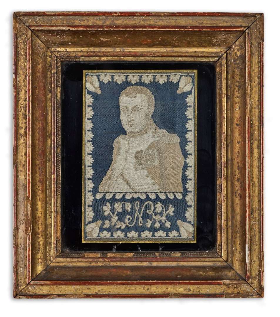 SOIERIE LYONNAISE du début du XIXe siècle représentant le portrait de l'Empereur Napoléon Ier en buste de trois quart en tenue de chasseur à cheval de la Garde Impériale et du chiffre N. La bordure ornée de festons et aux quatre angles, d'abeilles impériales. Présenté sous plaque de verre églomisé, dans un très beau cadre d'époque 9,5 x 6,2 cm (à vue) (Petit accident au cadre)