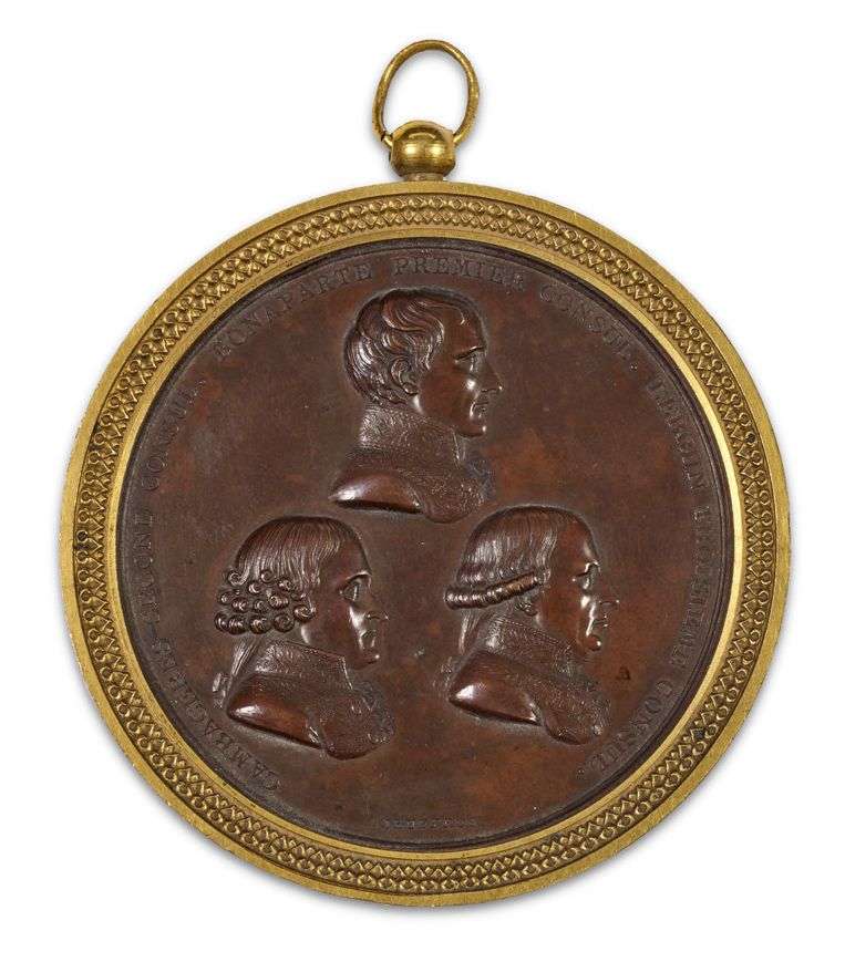 Description avers : Bustes posés en 1 et 2 de Napoléon Bonaparte, de Jean-Jacques Régis Cambacérès et de Charles-François Lebrun.