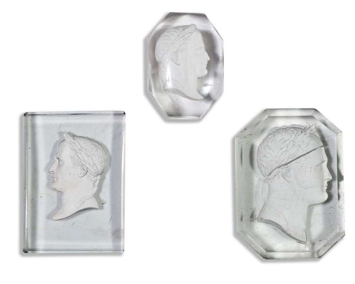 Deux plaques de forme octogonale en cristal à pans abattus ornées d'un cristallo-cérame représentant l'Empereur Napoléon Ier de profil en César. Le grand modèle présente une face bombée