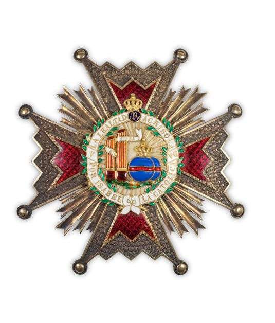 Superbe ensemble avec plaque de grand-croix en argent au monogramme d'Isabelle II d'Espagne, centre en or et émaux polychromes en fort relief. Revers avec deux crochets et épingle basculante. Travail de la maison Halley à Paris, seconde moitié du XIXe siècle TB à TTB. Avec son bijou en vermail et email.